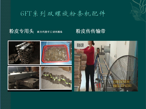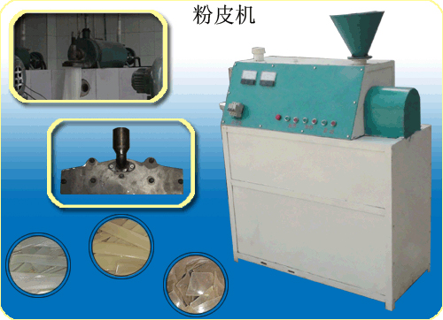 由汝陽縣機械廠生產的蒸汽式粉條機,配用傳輸帶、粉皮頭等配件,可生產不同規格的粉皮、川粉。分為粉皮頭、川粉頭,粉皮頭生產的成品寬度為38-40公分,厚度可調節,由傳輸帶配套。生產后可根據自己的需要切割尺寸。川粉頭外觀和粉皮頭酷似,但漏粉部有固定的尺寸,型號不一,一般生產的為幾種市面常見的川粉模具。現很多大型企業都在應用,成品理想,操作簡單。